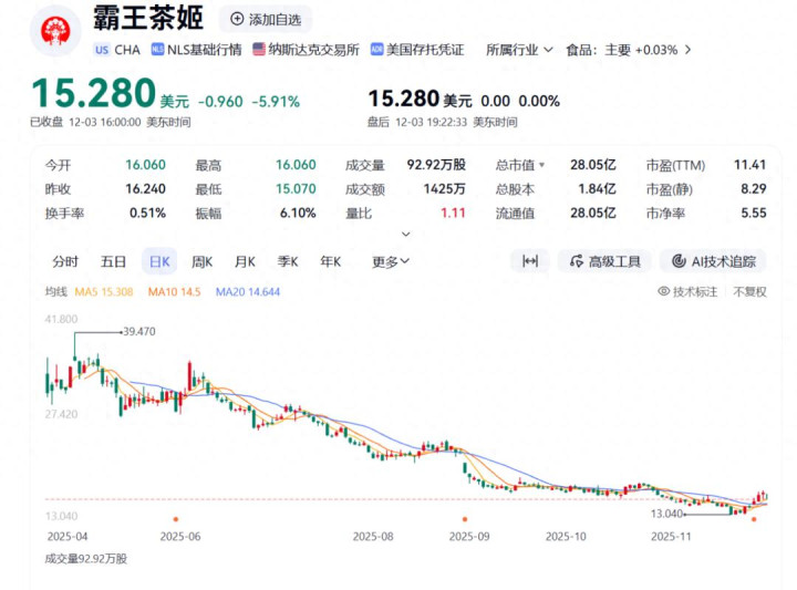 分红消息一出,霸王茶姬的股价连涨几天,市值也从24亿美元的低谷,短暂地回到了29亿美元。美股的投资者们,似乎很吃这一套。只是还没高兴两天,12月3日开盘,霸王茶姬股价又低开了,截至当日收盘,市值跌至28亿美元。
