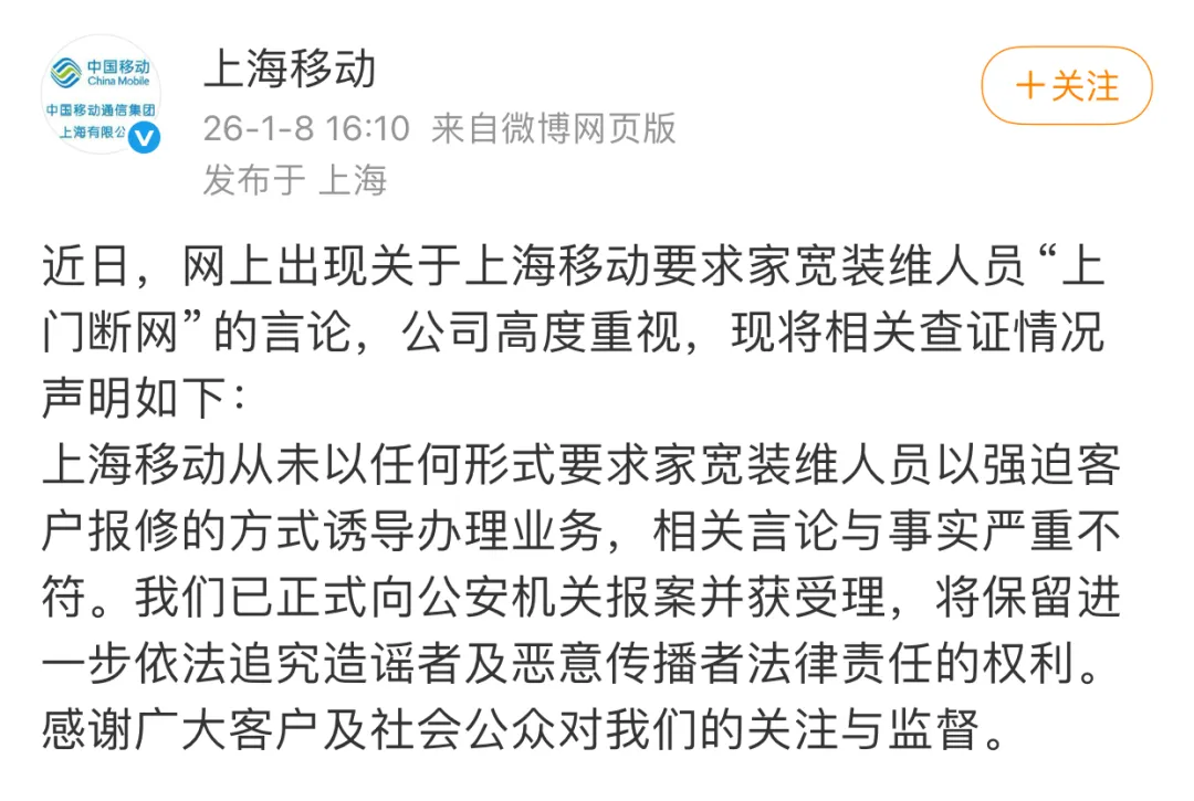 上海移动从未以任何形式要求家宽装维人员以强迫客户报修的方式诱导办理业务,相关言论与事实严重不符。我们已正式向公安机关报案并获受理,将保留进一步依法追究造谣者及恶意传播者法律责任的权利。感谢广大客户及社会公众对我们的关注与监督。